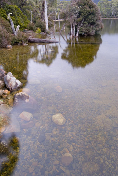 Clear still lake with the stones and rocks on the bottom clearly visible and reflections of surrounding trees mirrored on the calm water