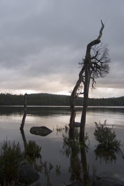 nature, silhouette, environment, tree, scenery, calm, water, reflection, lake, dead, cloudy, stark, australia, tasmania, lake st clair