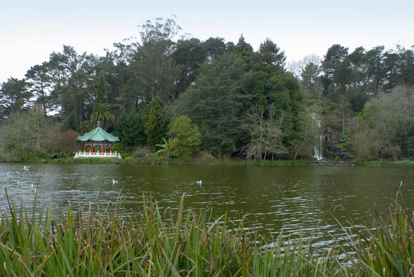 looking across stow lake at the ornamental pagoda, golden gate park, san fancisco