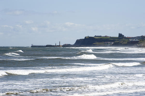 ocean, waves, scenic, surf, coast, coastline, view, town, distance, england, sightseeing, cliffs, harbour, topography, piers, whitby, north yorkshire, headland, whitby abbey, sandsend