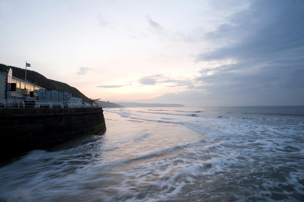 Whitby looking towards Sandsend along the coast with a delicate sunset lighting up the surf