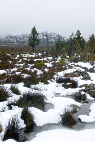 central tasmania highlands on a winter day, snow coveres alpine vegetation