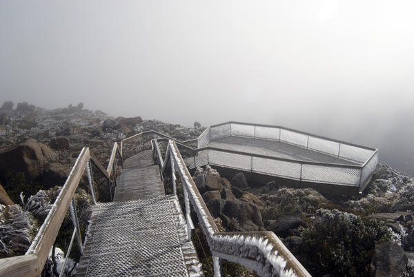 tasmania, australia, deck, platform, tourism, freezing, frosty, observation, viewing, fog, summit, weather, condensation, shrouded, mount wellington, winter, travel, sightseeing, structure, walkway