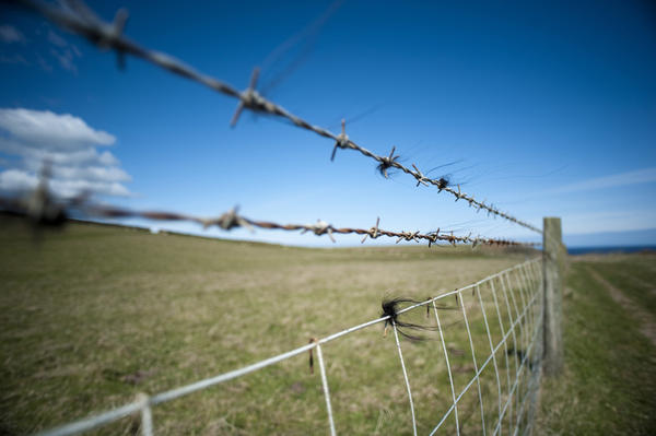 barbed, wire, fence, land, countryside, farm, limit, property, sky, summer, rural, field, pasture, rustic, secured License: