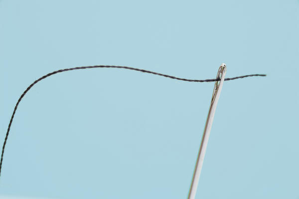 background, blue, closeup, copy, curved, curving, eye, needle, needlework, sewing, space, threaded, cotton, haberdashery, hole, blue, baby blue, sky blue