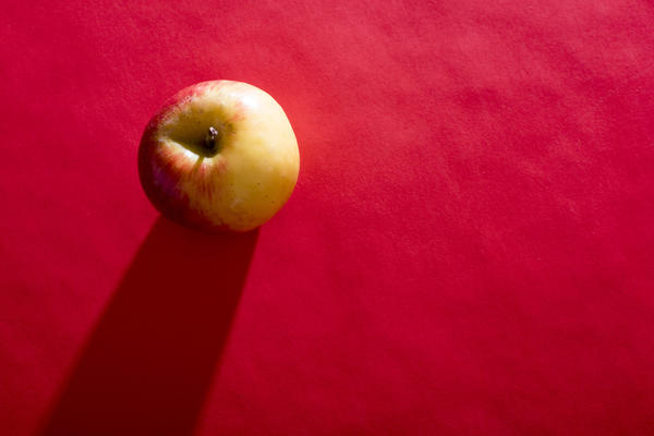 One apple lit by bright light, forming a long shadow, isolated on a red background.