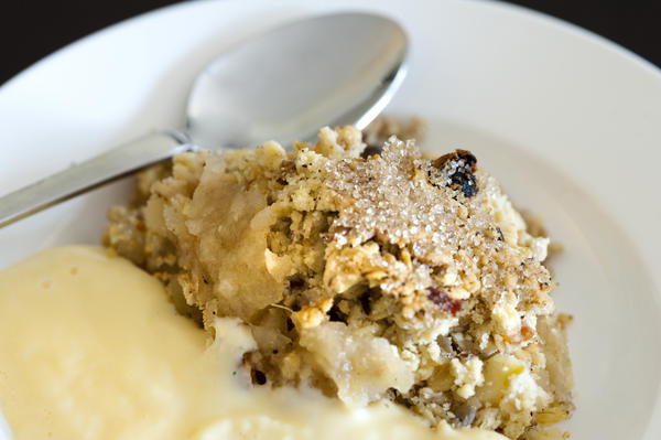 Apple crumble topped with sugar, cinnamon and raisins and served in a dish with custard