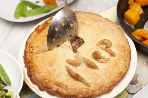 baking, crust, meat, pie, potato, serving, spoon, vegetables, lunch, pub, food, recipe, golden, whole, nutritious License: