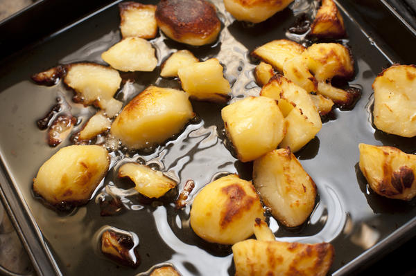 Close-up of potatoes roasting in oil-9320