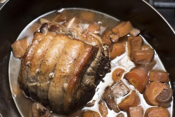 beef, food, joint, meat, trussed, casserole, simmering, vegetables, cooking, carrots, pot, shoulder, closeup, overhead, recipe License:
