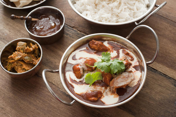 cuisine, food, high angle, table, wooden, asian, bowl, butter, chicken, indian, makhani, murgh, rice, sauces, garnished