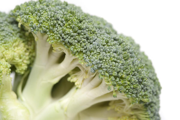Fresh head of broccoli viewed from the side showing the flower buds or florets and the edible stalk