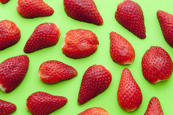 Halved red strawberries on a lime green background forming a striking background pattern