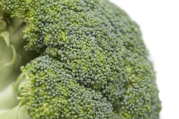 Head of fresh green broccoli showing the densely packed florets on a white background