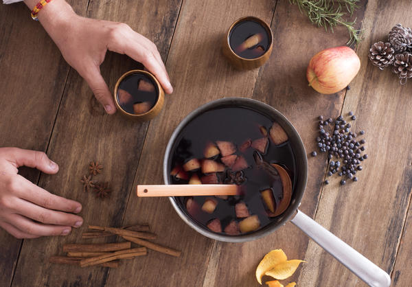beverage, christmas, festive, fruity, hot, mulled, red, spicy, wine, ingredients, man, mugs, overhead, serving, saucepan