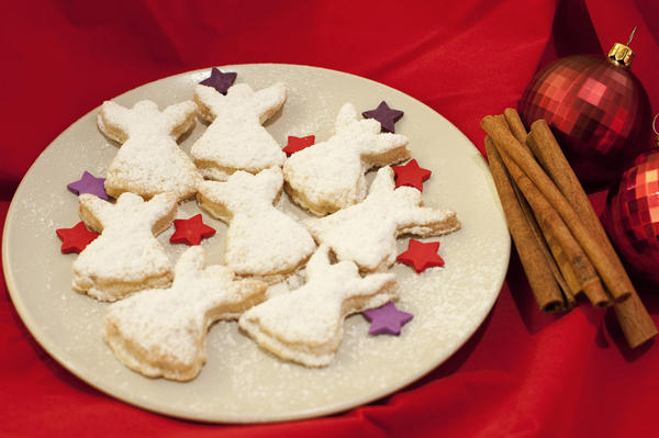angel, baked, baking, biscuits, christmas, confectionery, cookies, festive, food, golden, high angle, homemade, red, purple, icing, pastries, plate, seasonal, serving, stars, sugared, table, xmas