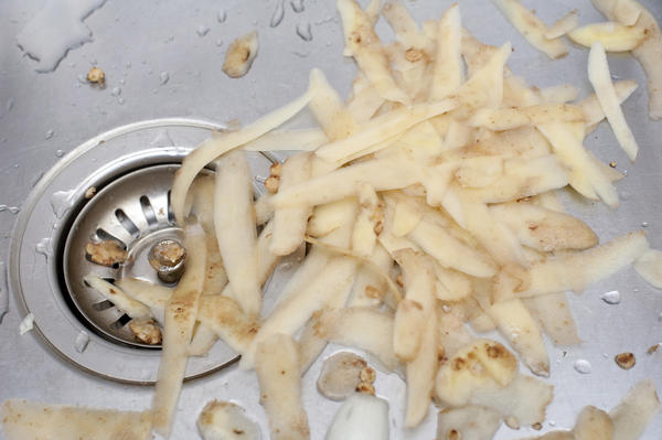 cleaning, cookery, cooking, culinary, discarded, food, fresh, ingredient, kitchen, peelings, peels, plug, potato, preparation, remnants, sink, stainless steel, vegetable, vegetarian, waste