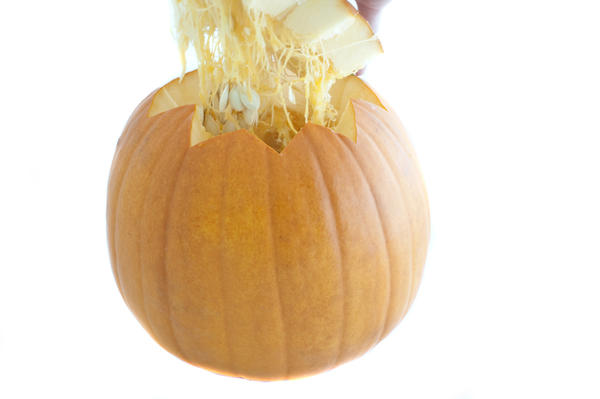 Pumpkin with a cut out top in the shape of a star being lifted clear and showing the fibres from inside
