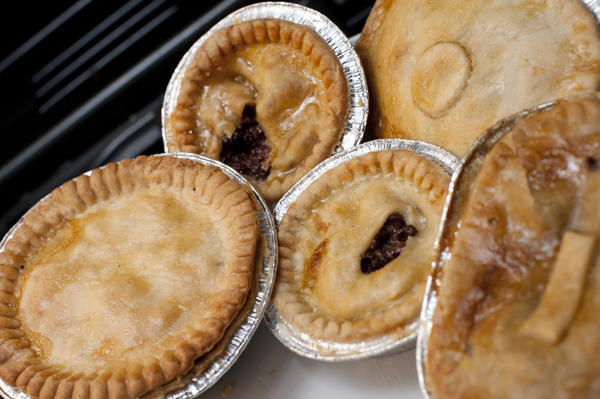 aluminum, baked, cooked, delicacy, european, food, meat pie, nobody, pans, pastry, ready to eat, various, delicious, five, round, brown License: