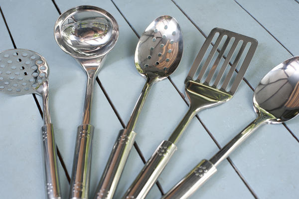 cooking, cookware, kitchenware, set, utensils, spatula, spoon, household, objects, metal, silver, stainless steel, strainer, ladle, clean