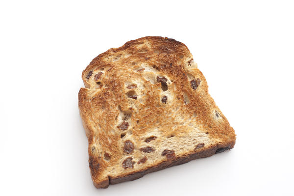 Slice of toasted fruity raisin bread on a white background, high angle view