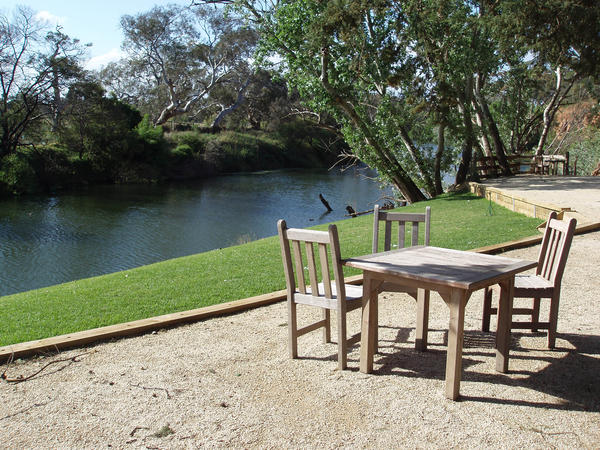 table, chairs, riverside, wooden, wood, gravel, banks, river, calm, quiet, peaceful