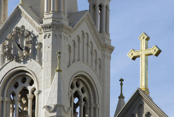 cathedral architecture details, gold cross and clock tower, saints peter and paul at washington square, sanfrancisco