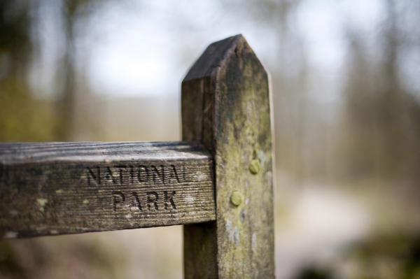 Rural wooden National Park bar gate giving access to Park land with the words National Park clearly stamped into the wood