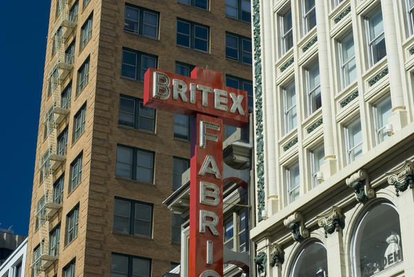 buildings facade, frontages, tower, up, upward angle view, architectural, architecture, old, tall, shops, apartment blocks, red, britex fabrics, cross, electric, arches