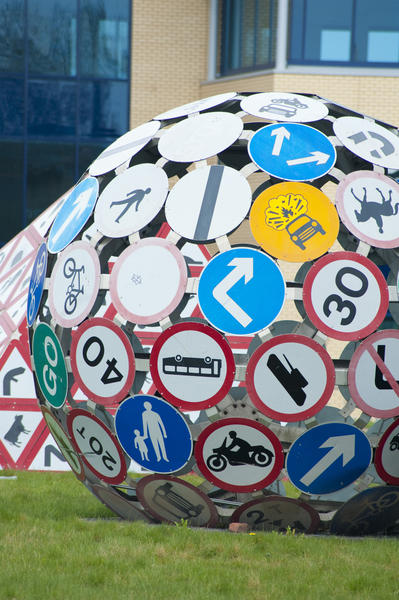 Spherical roadsign sculpture on the Magic Roundabout, Splott, Cardiff designed by Pierre Vivant