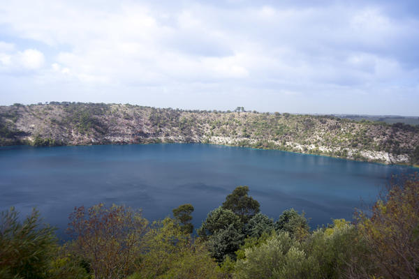 The blue lagoon or caldera lake in Mt Amber volcano crater, Australia in a scenic landscape view