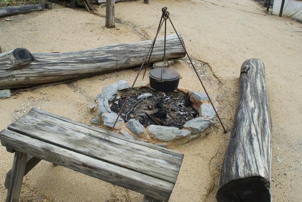 fire, campsite, cooking pot, metal, tripod, metal, pan, pot, log, wood, wooden License: