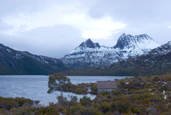 travel, winter, snow, mountain, wilderness, scenery, water, cold, morning, weather, australia, sightseeing, bleak, tasmania, jagged, lakeshore, cradle mountain, dove lake, boatshed, lake st clair national park License: