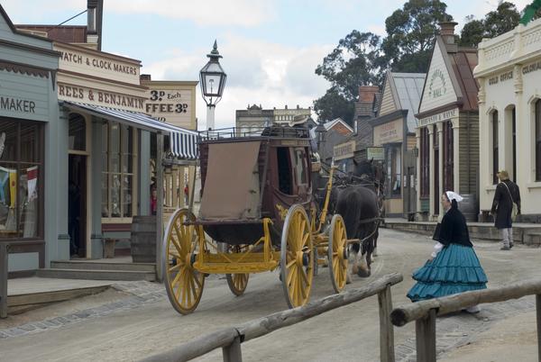 soverign hill, street scene, people, buildings, horse and cart, wagon, post, cartwheel, people, dress, woman, man, australia, australian License: