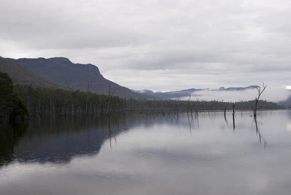 travel, trees, outdoors, mountains, distant, reflection, forest, lake, morning, dead, misty, australia, tasmania, flooded, rowallan