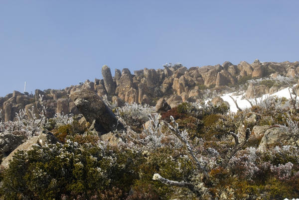 tasmania, australia, winter, environment, freezing, rocks, summit, weather, frost, formations, geological, boulders, topography, hoar, dolerite, mount wellington, plants, icicles, landscape, frozen License: