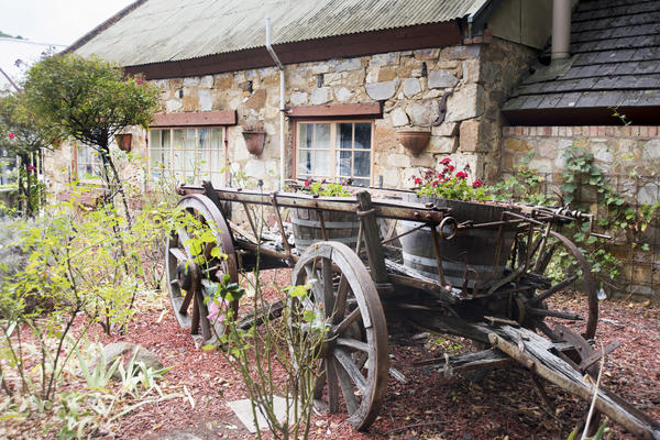 Old wooden cart with barrels of flowers in a landscaped garden alongside a historic stone building in Hahndorf, Adelaide, Australia