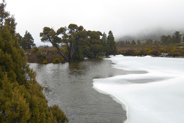 tasmania, australia, winter, ice, water, surface, frozen, freezing, weather, climate, temperature, pine lake, snow, wilderness, scenery, highlands, environment, misty, desolate, landscape License: