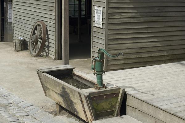 still, trough, water, wooden, old, hand pump, street, water, watering, troff License: