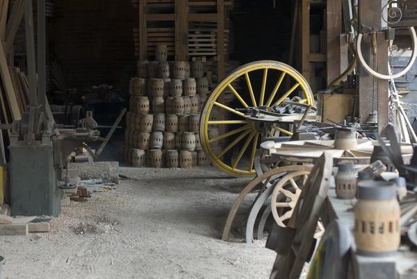 inside of a an old wheelwrights workship, wagon wheels, spokes and hubs. not commercial property released