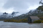 boatshed on dove lake with a snow coated cradle mountain in the background