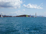 a fleet of sailing yachts competing in a regatta at airlie beach, queensland, australia