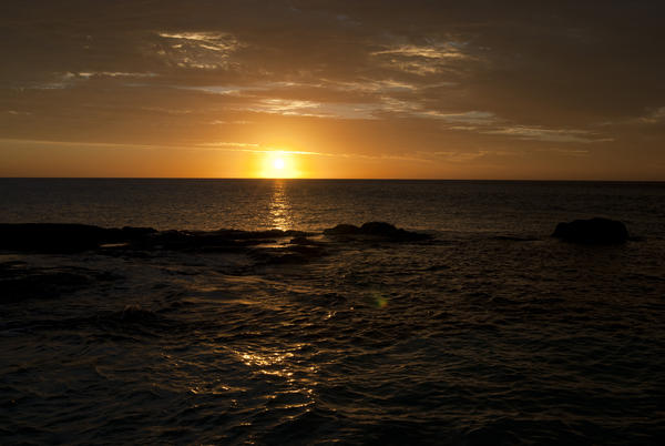 Golden ocean sunset with the orange orb of the sun just dropping below the horizon and lighting up the surface of the water