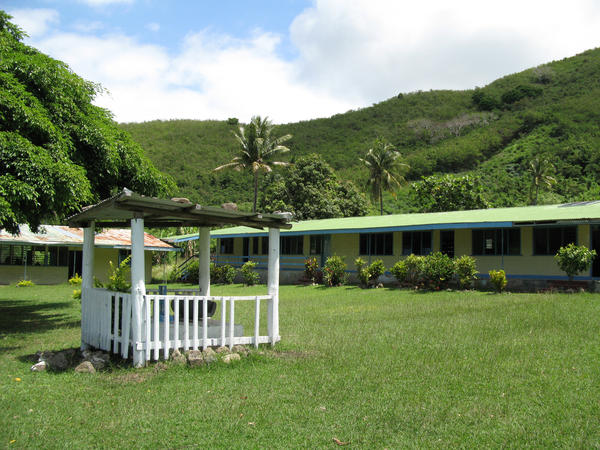 Long single storey school building at Marou, Fiji surrounded by lawns and lush tropical vegetation