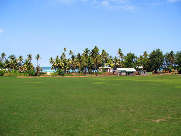 Looking across a lush green school playing field to the South Pacific Ocean, Yasawa, Fiji