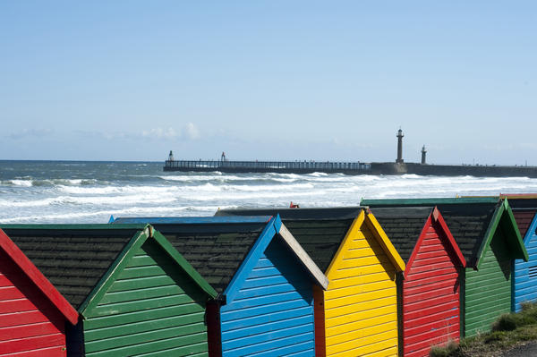 Brightly coloured wooden beach huts at Whitby Sands, West Cliff looking out across the ocean to the harbour entrance and piers