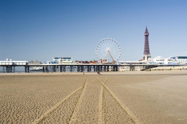 beach, beachfront, blackpool, blackpool tower, central pier, coast, england, entertainment, fairground, ferris wheel, historical, lancashire, landmark, resort, sand, scenic, tourism, tracks, vehicle, view