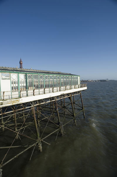 View of the historical structure of the Blackpool North Pier with its Victorian entertainment buildings extending out into the ocean