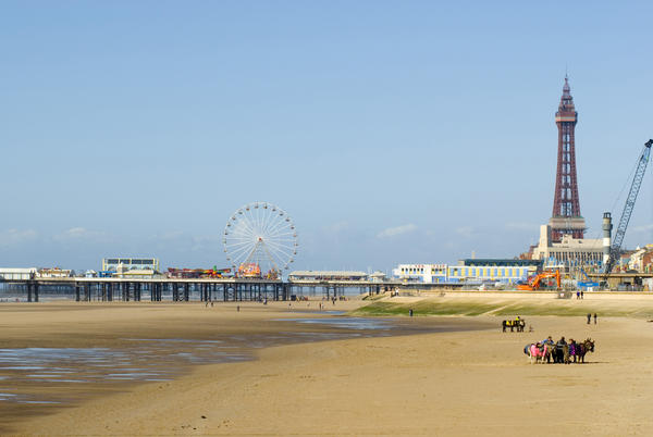 vacation, travel, tourism, beach, waterfront, sand, seaside, coast, view, resort, historical, landmark, england, rides, donkey, seafront, lancashire, blackpool, blackpool tower, central pier