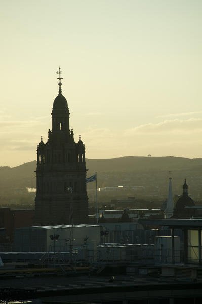 City Hall Tower, Glasgow in silhouette at dusk above the rooftops of the city centre